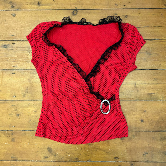 vintage 00s red polka dot crossover top with buckle