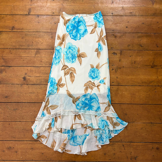 vintage 00s beige and blue floral mesh midi skirt