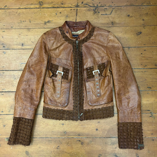 vintage 00s tan genuine leather buckle jacket