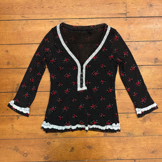 vintage 00s black polka dot and red ditsy floral mesh top