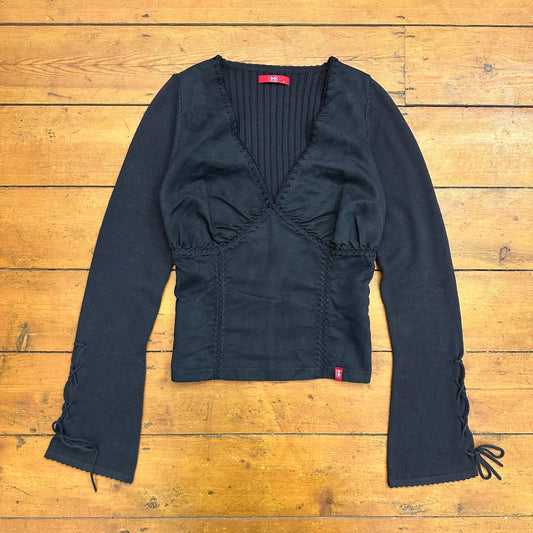 vintage 00s black embroidered v neck long sleeve top