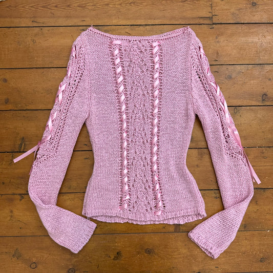 vintage 00s pink crochet ribbon jumper