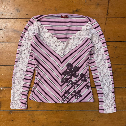 vintage 00s pink and purple striped lace trim jumper