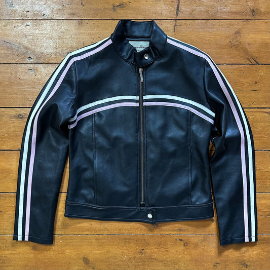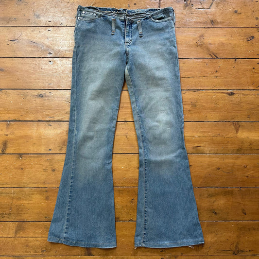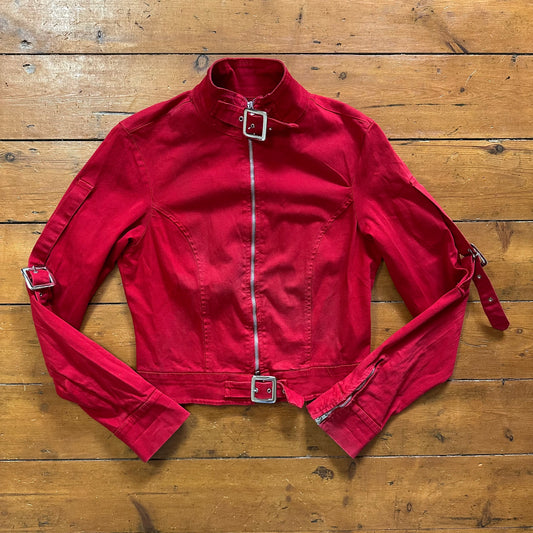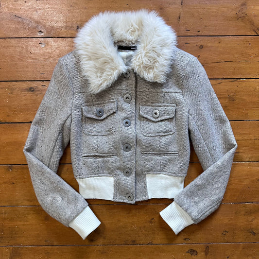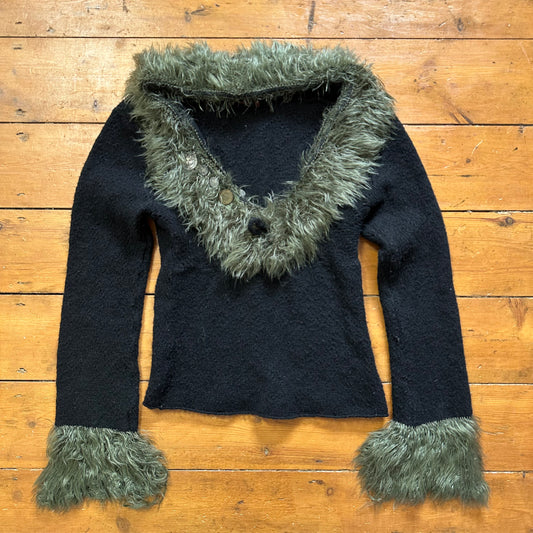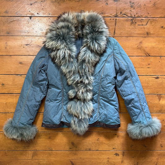vintage 00s blue padded afghan jacket with faux fur trim and buckles