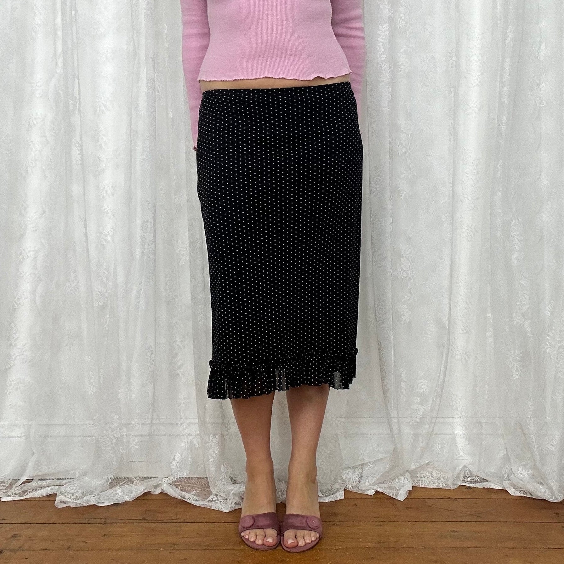 vintage 00s black polka dot mesh midi skirt