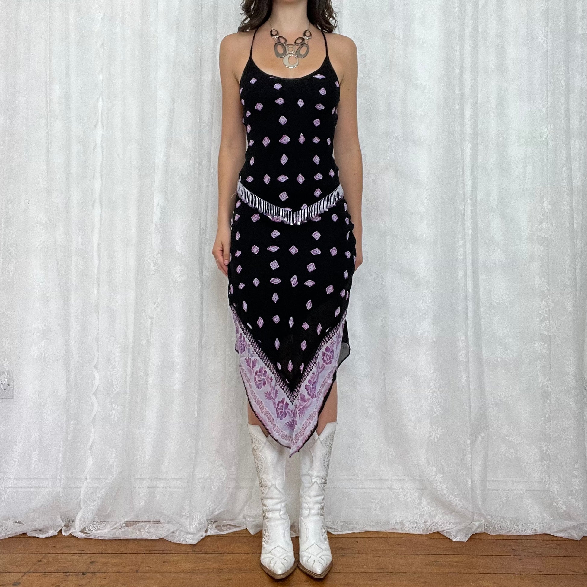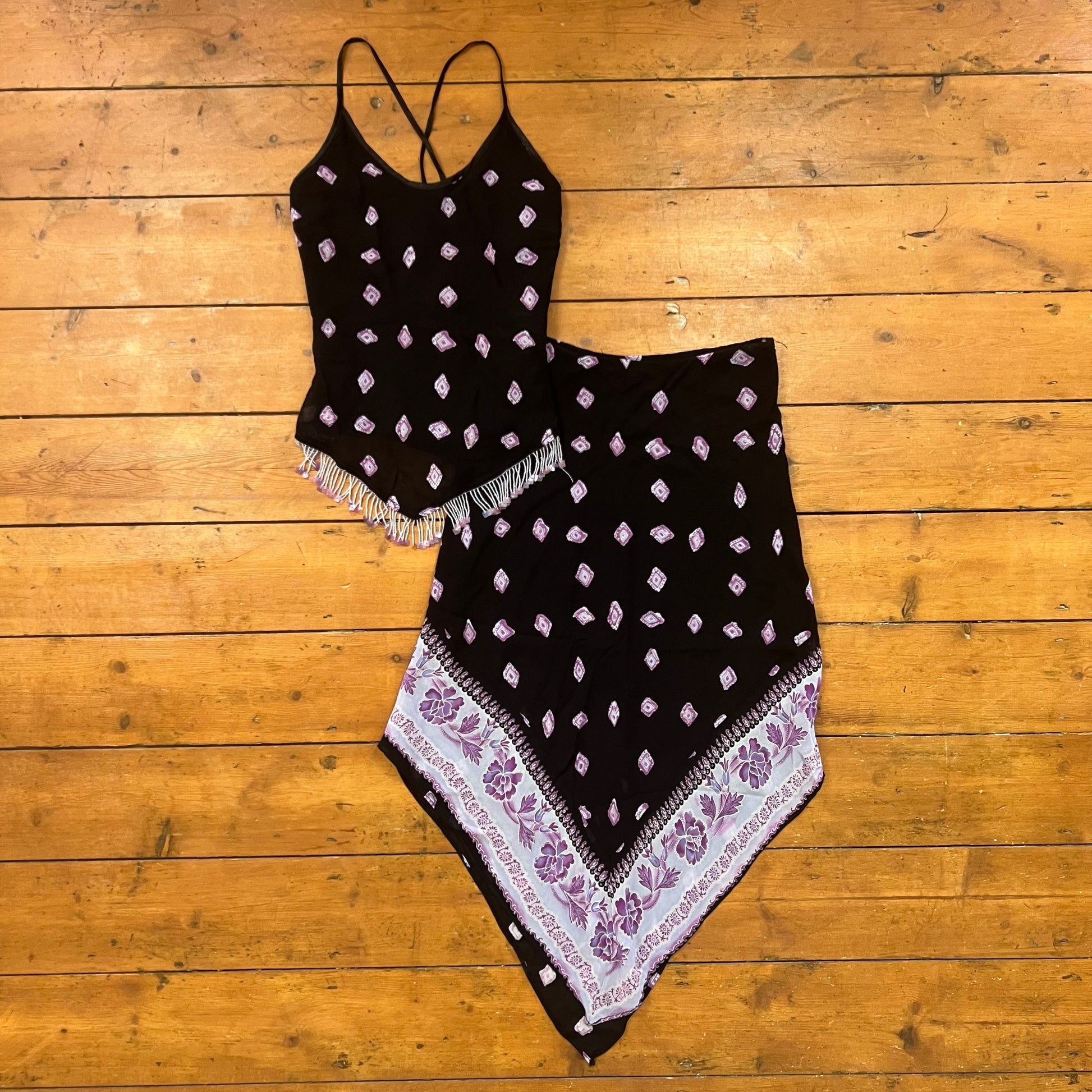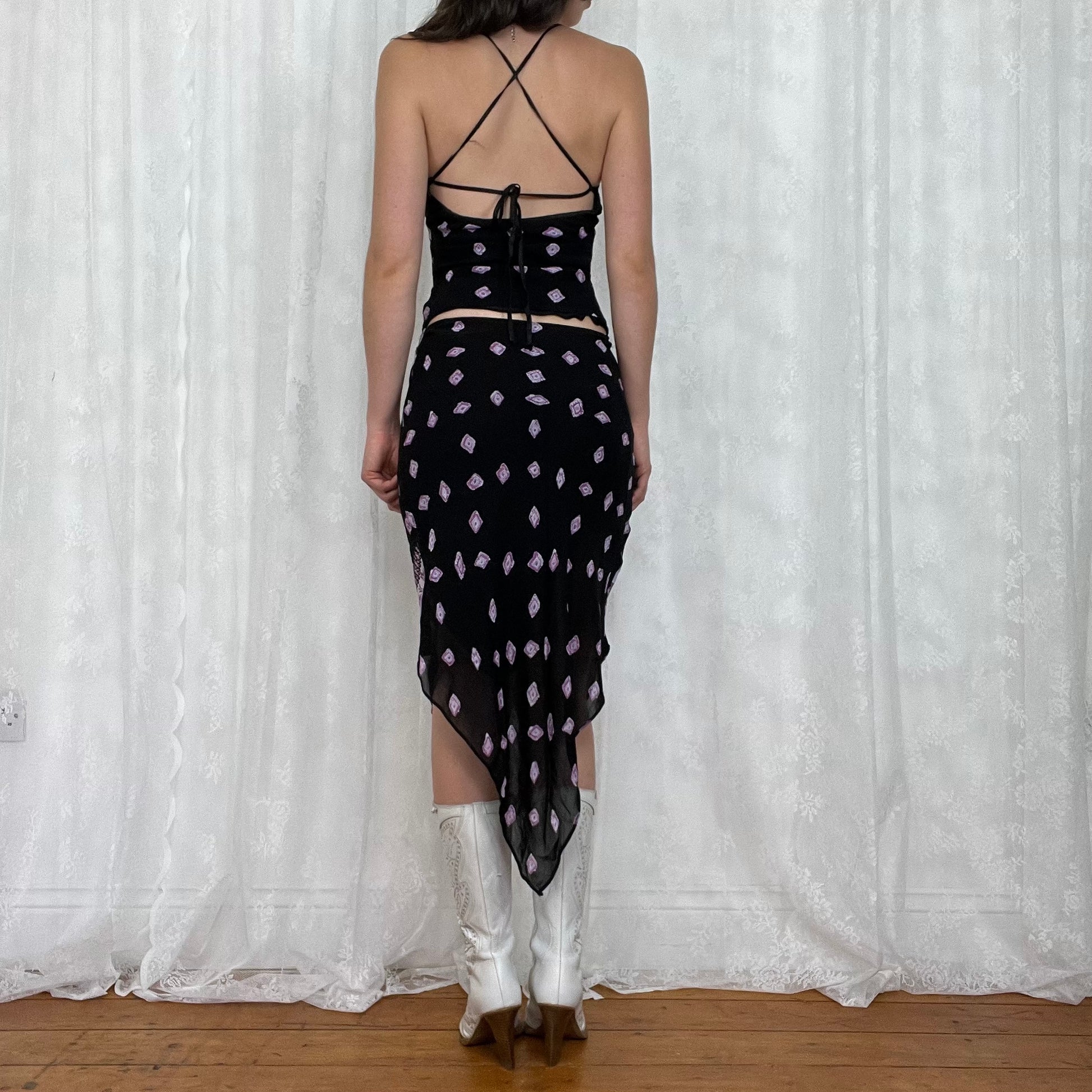 vintage 00s black and purple beaded top and handkerchief skirt co ord