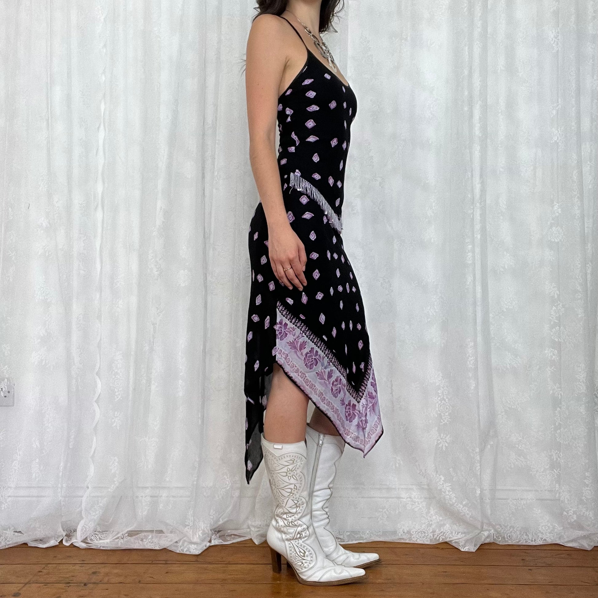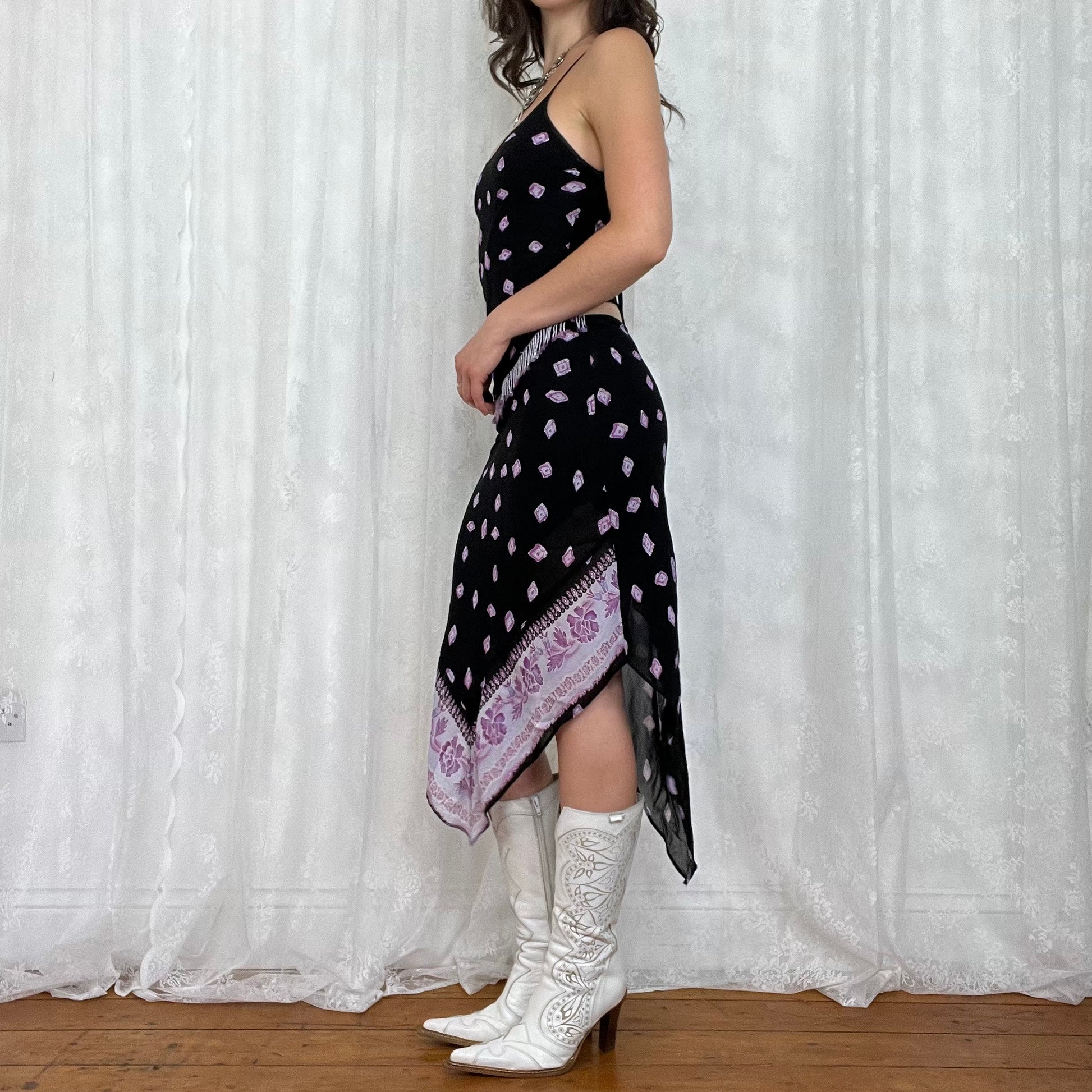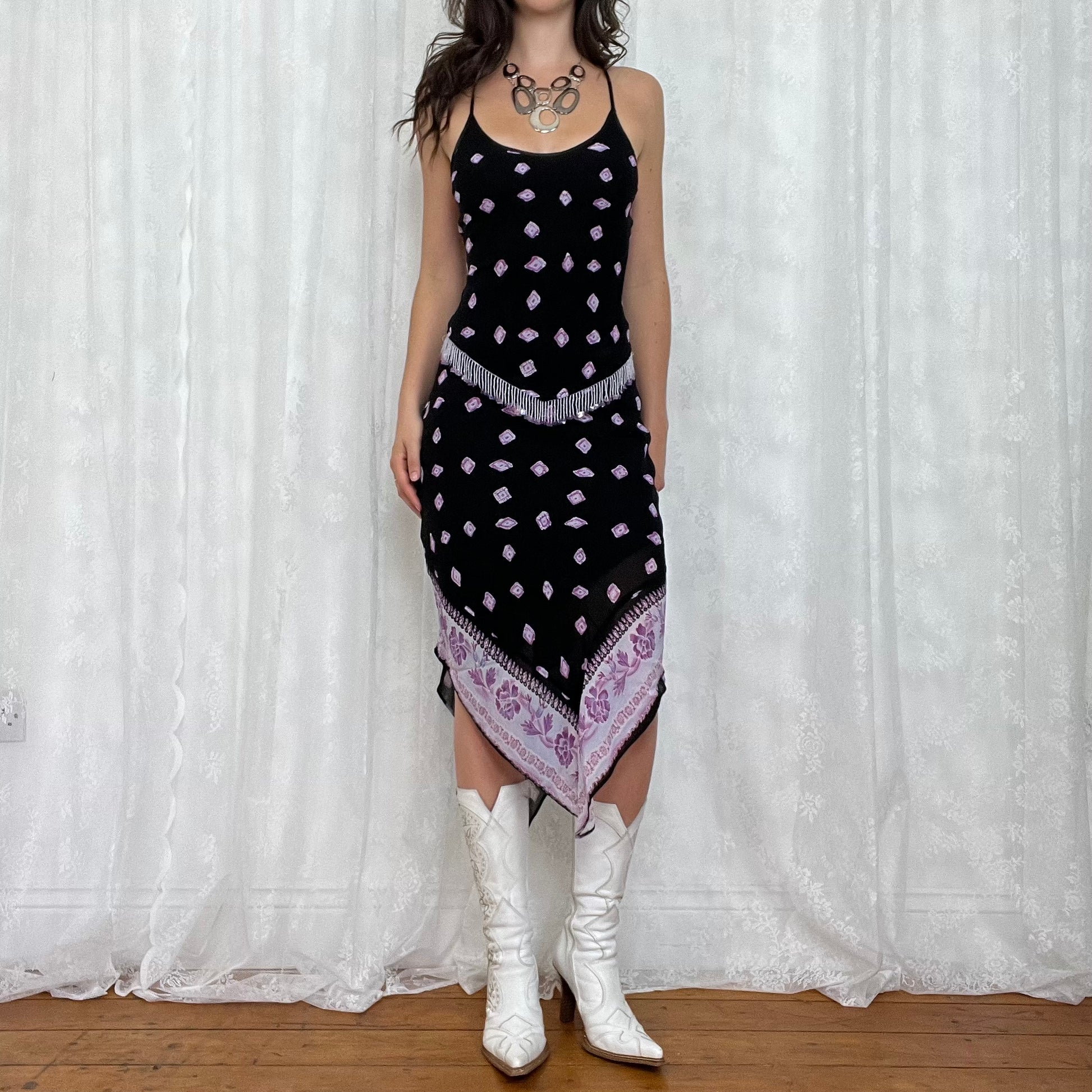 vintage 00s black and purple beaded top and handkerchief skirt co ord