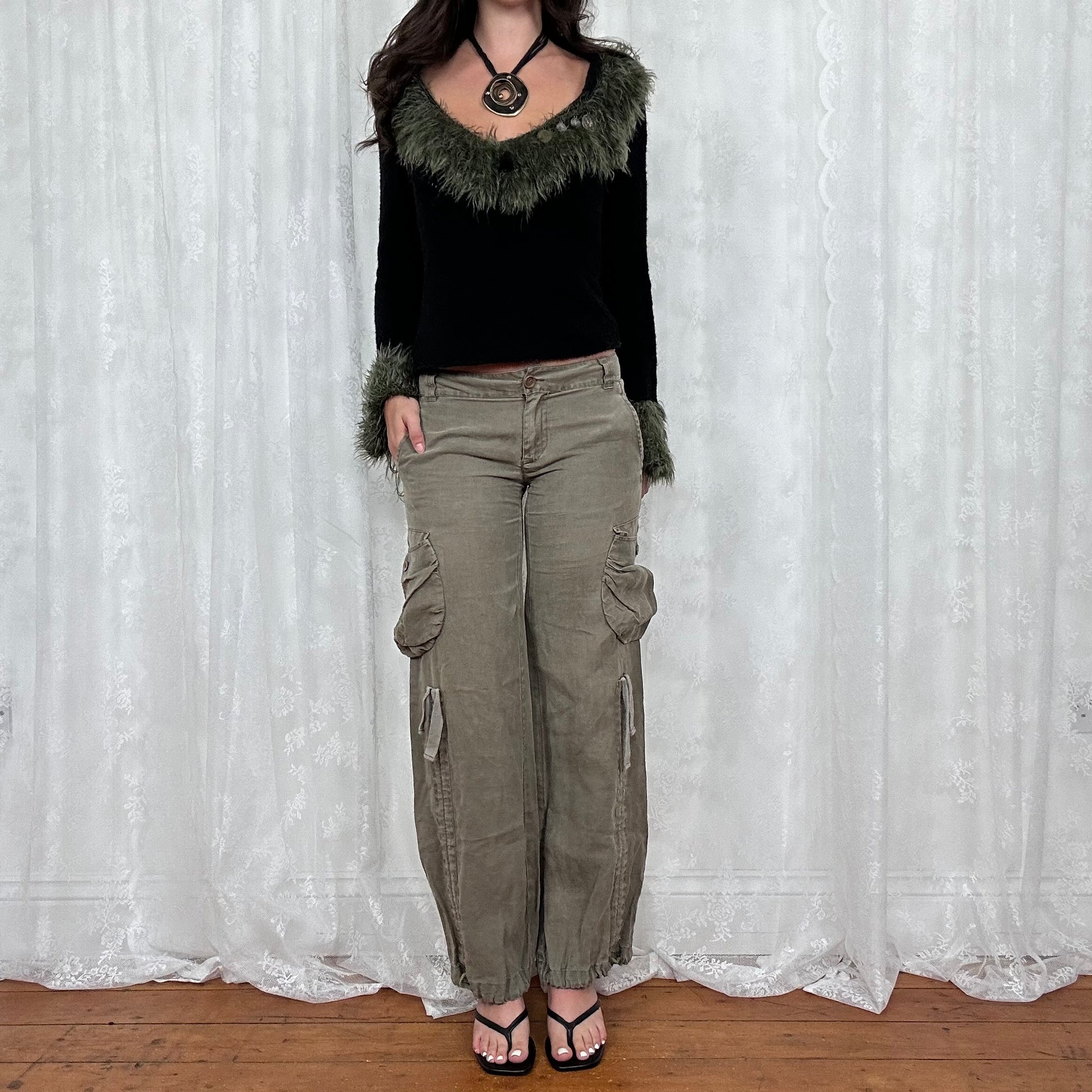khaki green faux fur trim on collar and cuffs. coin details on the collar also!