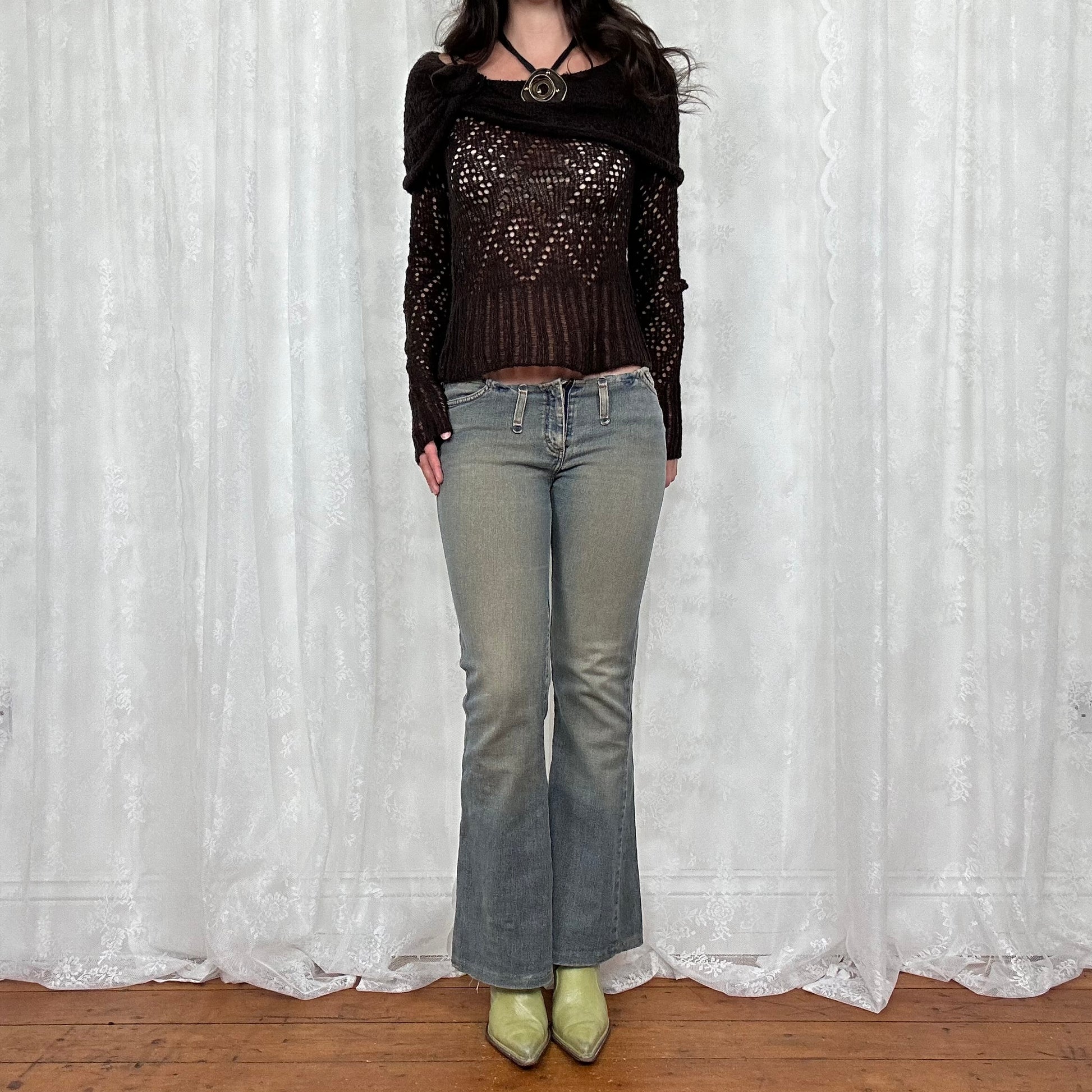 vintage 00s brown crochet knitted off shoulder jumper with rose