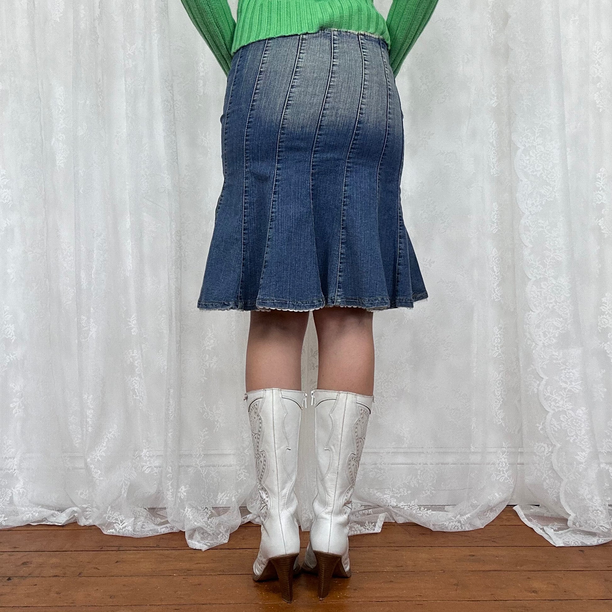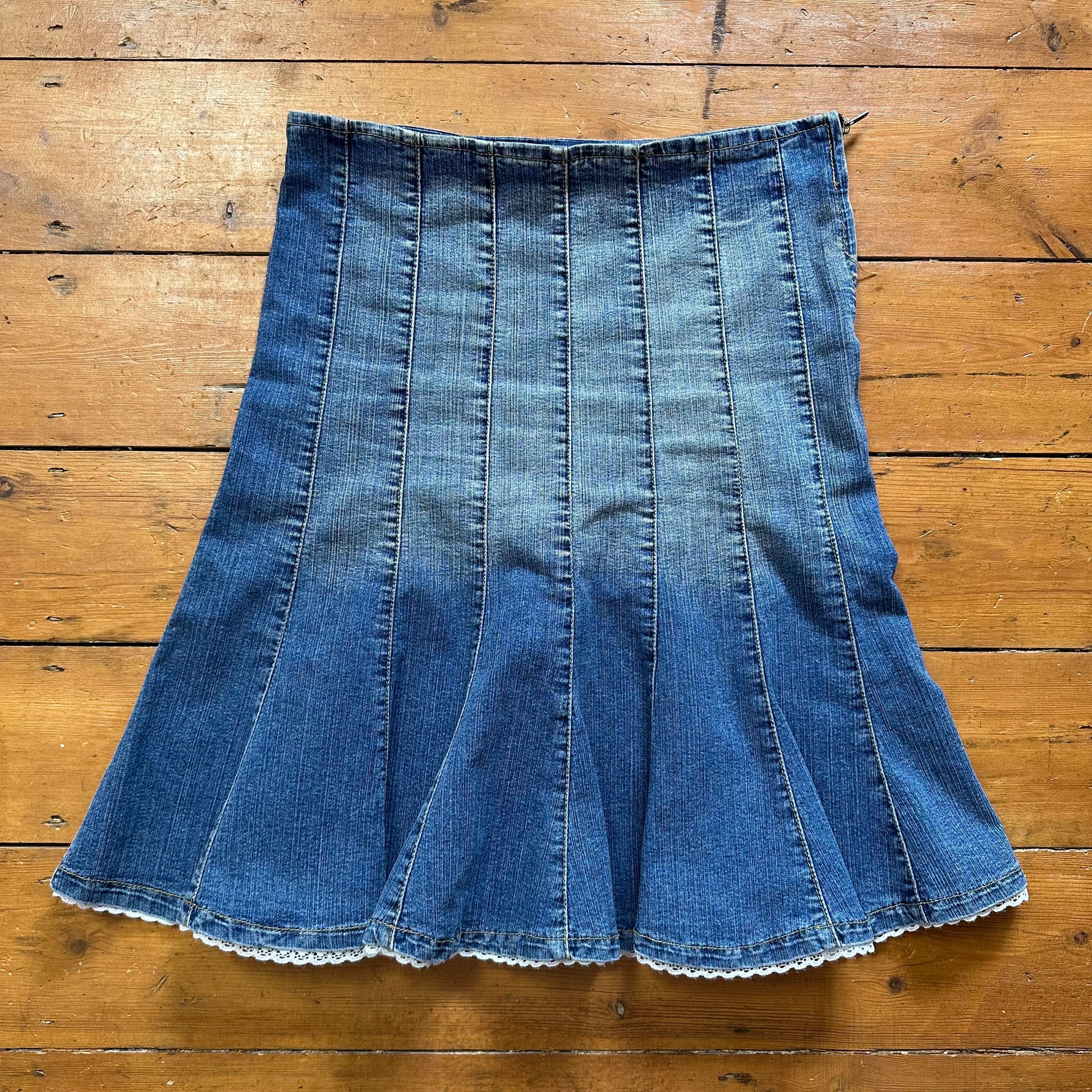 vintage 00s denim panel midi skirt with broderie trim