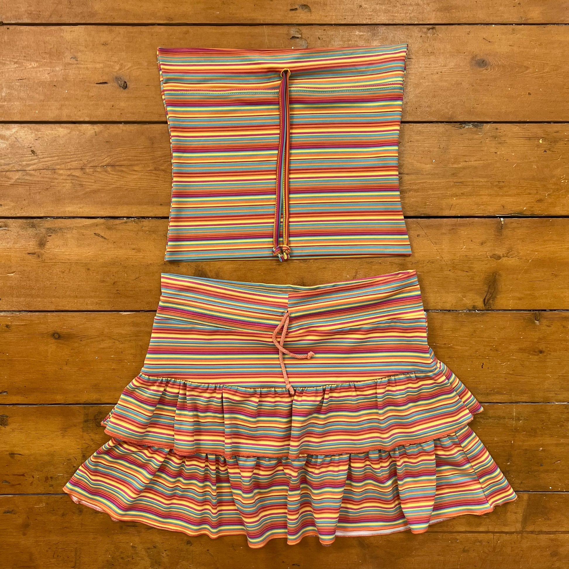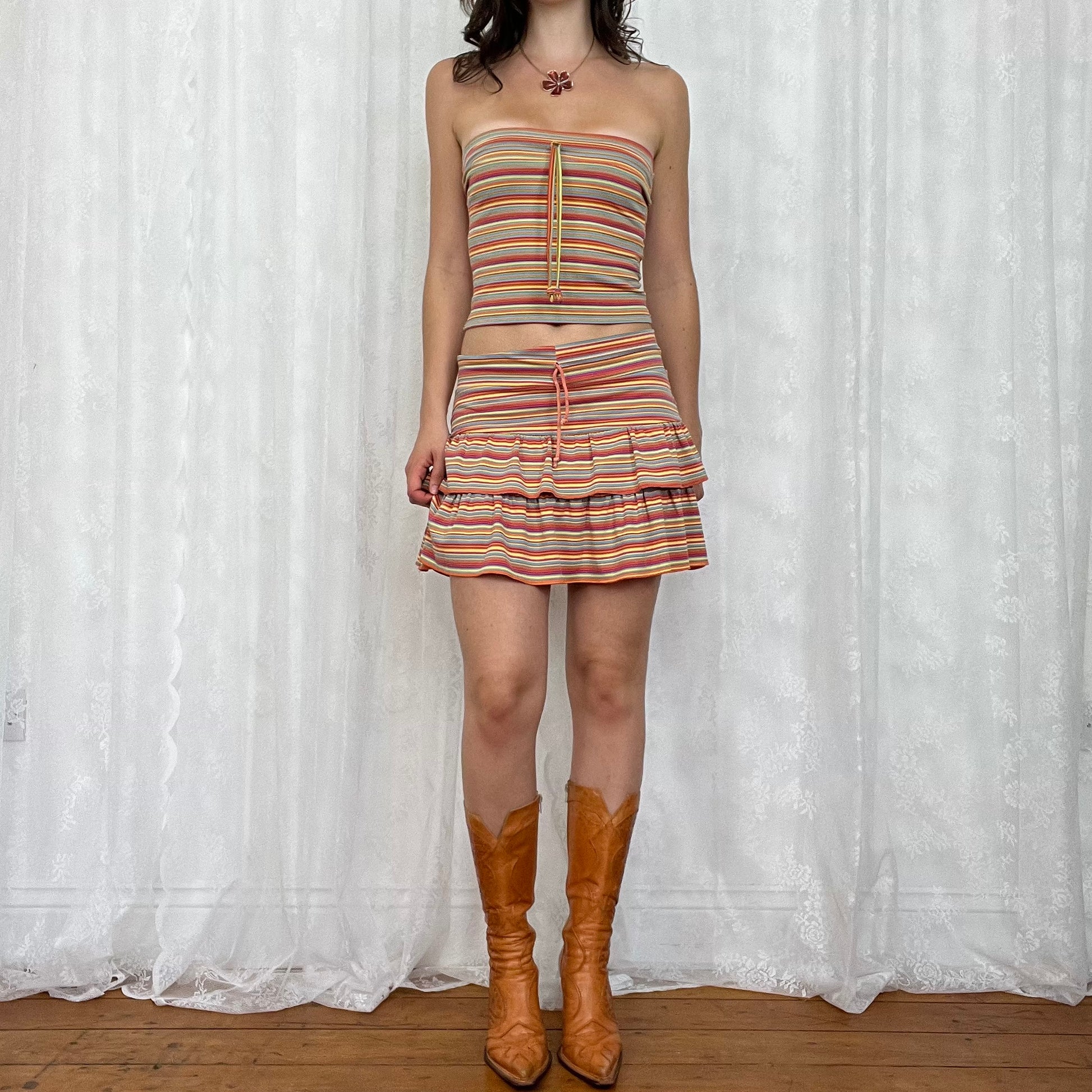 vintage 00s rainbow striped bandeau and ruffle mini skirt co ord